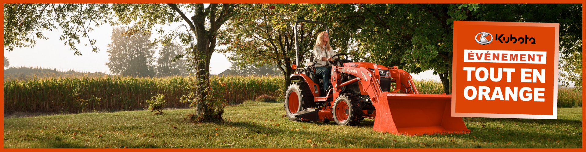 Valid at participating Kubota dealers in Canada. Discount valid on purchase of new equipment only as marked. To receive the discount coupon, customer must register at the participating Kubota Canada dealer between April 1st to June 30th, 2026. Coupon cannot be used in combination with other coupons or any other special discount (i.e. government, multiple, on-line, price fighter discounts, special client, direct mailer or policy type discounts). Coupon value will be deducted before taxes. Coupon: (i) cannot be applied to past transactions; (ii) has no cash surrender or other value; and (iii) expires after 30 days. Customer will have 30 days to redeem the discount on the applicable new equipment purchase. Some conditions apply, please see your participating Kubota dealership for more details. National promotions and the Big Orange Event can be combined on equipment as indicated.